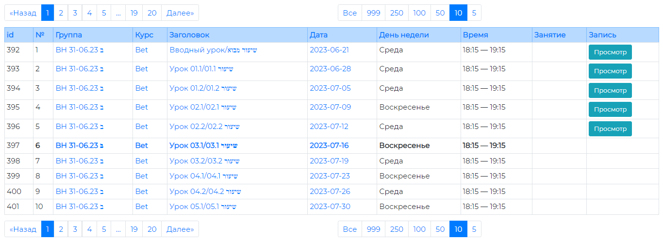 Рассмотрим подробнее информацию, представленную в расписании. Строки расписания по умолчанию выводятся порциями по 10 строк, однако нажатием на иные варианты (50, 100, 250, 999 или ВСЕ) можно изменить размер такой порции. Жирным шрифтом выделены текущая дата и занятия, которые должны состояться в этот день.