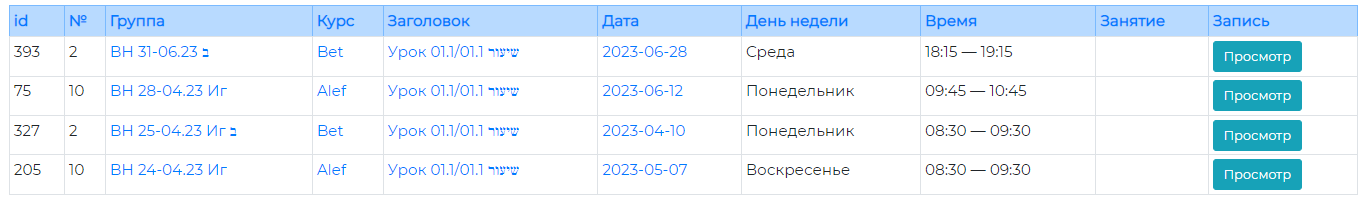 Нажатие на название того или иного столбца, находящееся в заголовке стаблицы, позволит отсортировать строки таблицы по этому параметру (например, по номеру занятия, по курсам, по названиям уроков, по дате и т. п.).