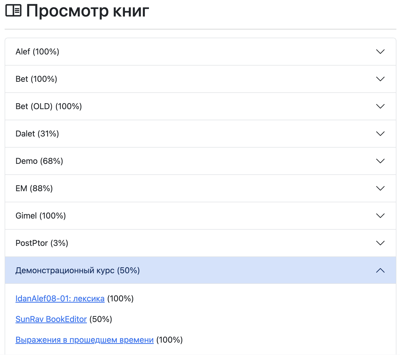 Все книги распределены по курсам. Чтобы выбрать книгу, сначала нужно открыть курс, щелкнув по нему. Открыв курс, можно увидеть список книг, входящих в этот курс. Для каждого курса в скобках указано на сколько процентов пройден курс. На рисунке ниже открыт курс "Демонстрационный курс". Щелкните по названию книги, чтобы её открыть. Для каждой книги в скобках указан процент открытых глав.