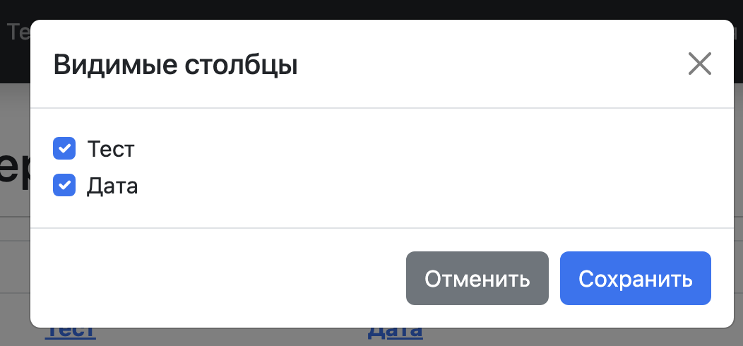 Выбор столбцов для показа данных (в данном случае для показа списка незавершенных тестов) осуществляется с помощью кнопки . В появившемся диалоге выберите столбцы, которые нужно показать и нажмите кнопку Сохранить (или кнопку Отменить чтобы отменить выбор).