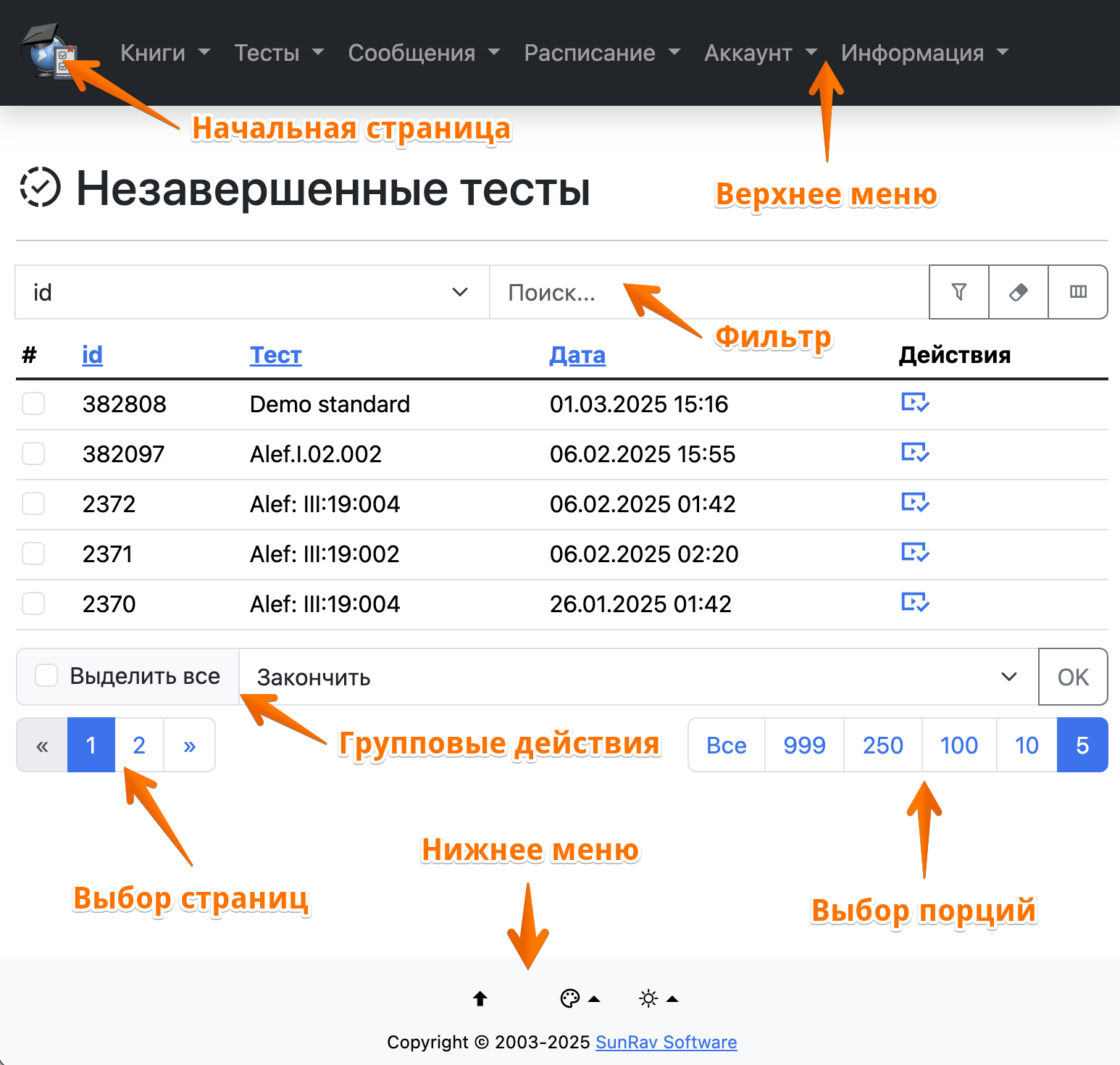 С некоторыми данными можно производить групповые действия. Например, для незавершенных тестов, их можно все сразу завершить. Для этого выберите действие в списке доступных действий, выберите данные (строки) к которым нужно применить действие и нажмите кнопку ОК.